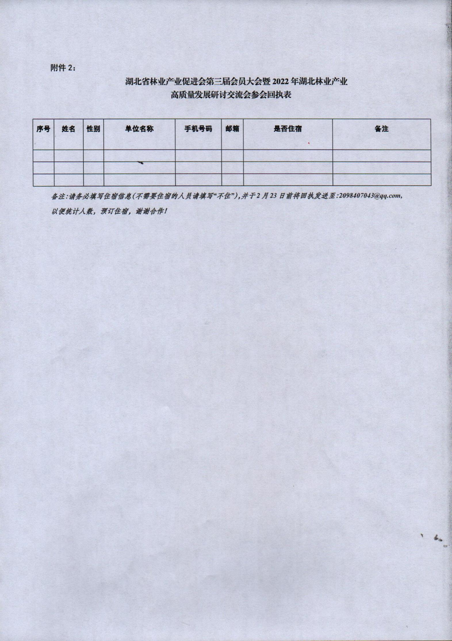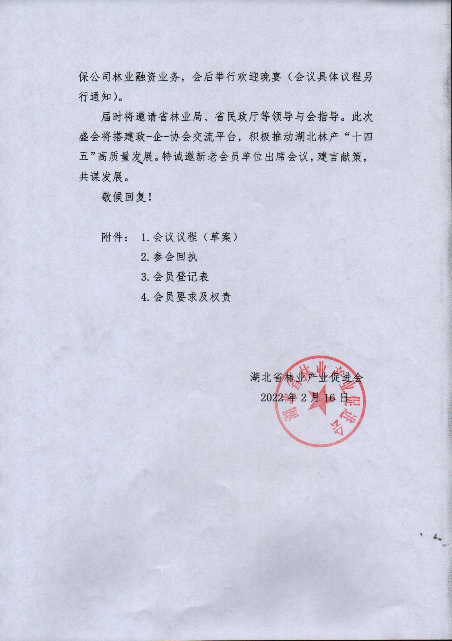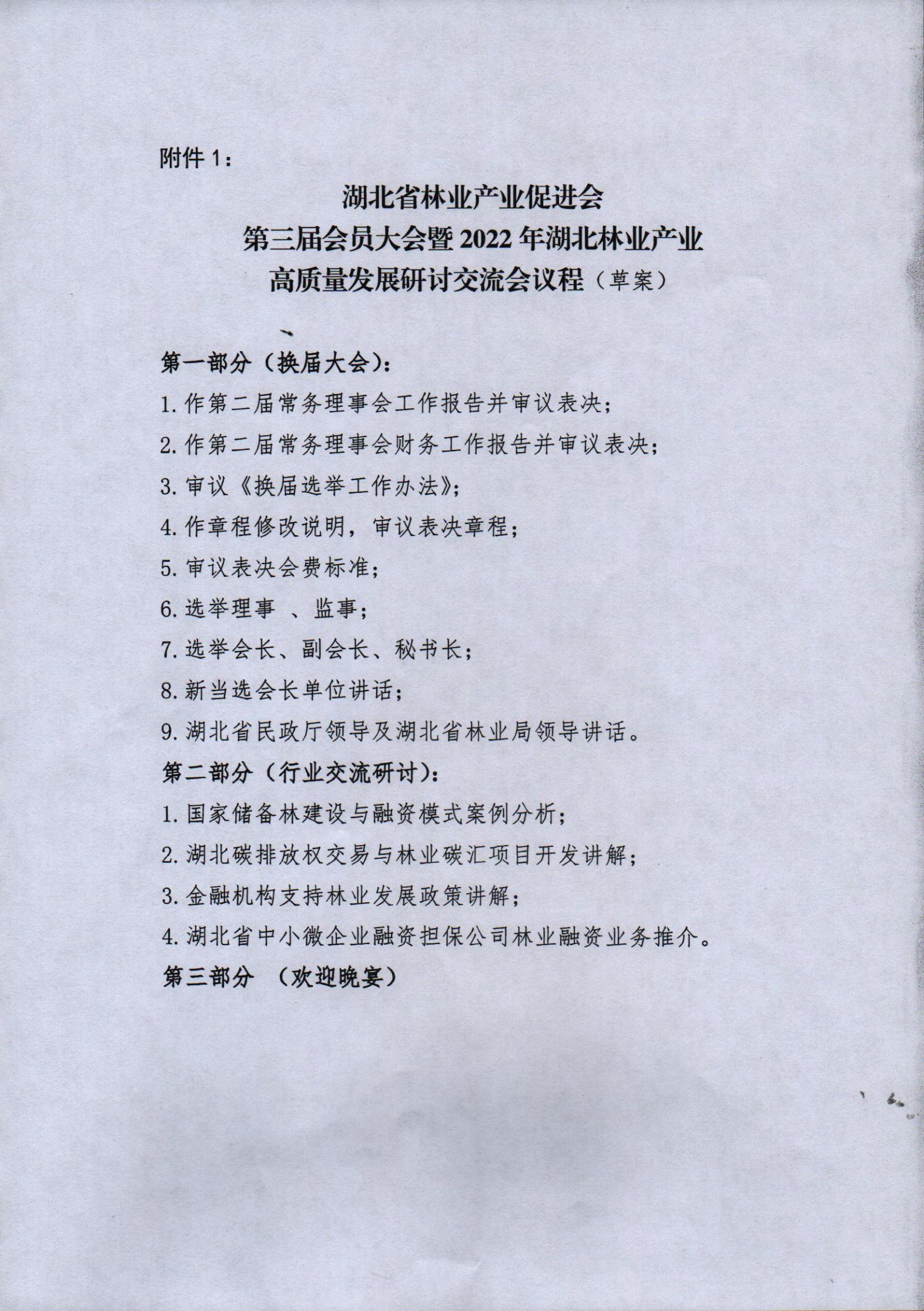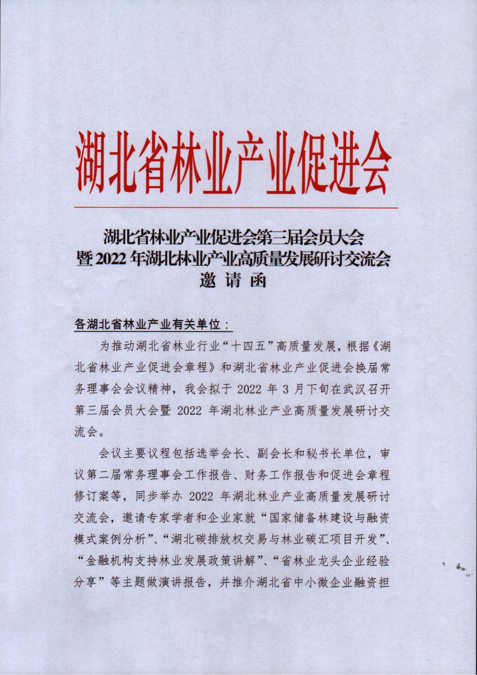 根据湖北省林业产业促进会常务理事会换届会议精神,湖北省林业产业促进会拟于2022年3月下旬在武汉召开第三届会员大会暨2022年湖北林业产业高质量发展研讨交流会,会议主要议程包括选举会长、副会长和秘书长单位,审议第二届常务理事会工作报告、财务工作报告和促进会章程修订案等,同步举办2022年湖北林业产业高质量发展研讨交流会,邀请专家学者和企业家就“国家储备林建设与融资模式案例分析”、“湖北碳排放权交易与林业碳汇项目开发”、“金融机构支持林业发展政策讲解”、“省林业龙头企业经验分享”等主题做演讲报告,并推介湖北省中小微企业融资担保公司林业融资业务,会后举行欢迎晚宴。届时将邀请省林业局、省民政厅等领导与会指导。