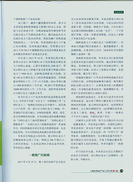 2014年5月,在由湖北省林业产业促进会主办的《湖北林业产业》2014年春(总第9期)的林业专业杂志上刊登了《五峰玉兰别样红》一文。
