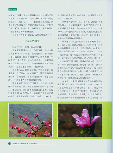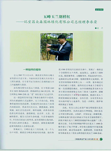2014年5月,在由湖北省林业产业促进会主办的《湖北林业产业》2014年春(总第9期)的林业专业杂志上刊登了《五峰玉兰别样红》一文。